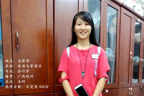 来自广西钦州的龙萍芳,初次来到大学,她很开心。虽然说是在广西长大的,但长这么大第一次离家这么远,自己一个人独自远行,兴奋而又忐忑。既害怕自己没有适应大学的生活,又对大学生活充满了期待。刚到学校门口,就有热心地学长学姐前来接待,一路帮她提行李到宿舍,这让刚来到这里的她立刻就感受到了这个学校的温馨,心里温暖了很多。