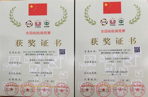 11月27日-30日,由国家体育总局体操运动管理中心、中国大学生体育协会主办的2015-2016年全国啦啦操联赛(南宁站)暨中国啦啦之星争霸赛(南宁站)隆重举行。分校啦啦操队共参加了四个项目,并全部获奖,分别获得大学甲组双人花球自选动作第一名、大学甲组双人爵士自选动作第一名、大学甲组爵士规定动作第二名和大学乙组花球规定动作第三名的优秀成绩。