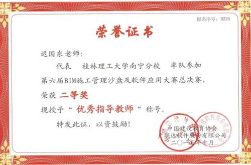 近日,由中国建设教育协会主办的全国中、高等院校BIM应用技能系列比赛暨第八届BIM算量大赛和第六届BIM施工管理沙盘软件应用大赛总决赛落下帷幕。分校学子在总决赛中均获得二等奖的优秀成绩,迟国东、许国平、潘培艳三位老师获得“优秀指导老师”荣誉称号。