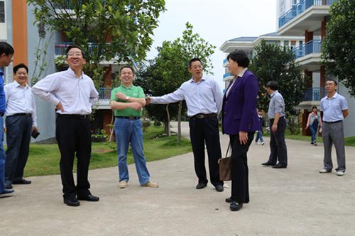 张学洪书记(前排左一)向霍健康厅长(前排中)介绍空港校园情况