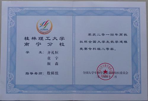 1月9日至11日,2014年高教杯全国大学生数学建模竞赛颁奖仪式暨工作会议在桂林航天工业学院举行。分校学子喜获专科组国家级二等奖1项,广西赛区一等奖1项、二等奖2项、三等奖2项。