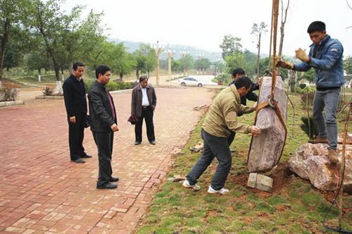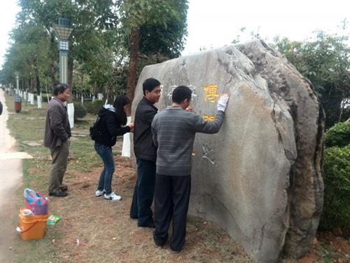 在检查中,王院长对校园文化景观石的布置提出了指导意见,并与工作人员一同对景观石刻字、着色等细节问题进行了交流探讨。校园文化景观石的建设工作是我校本学期构建文化育人环境的重点项目之一,目前景观石摆放已基本结束,石上文字篆刻及着色正进入收尾阶段,近期即将完成。