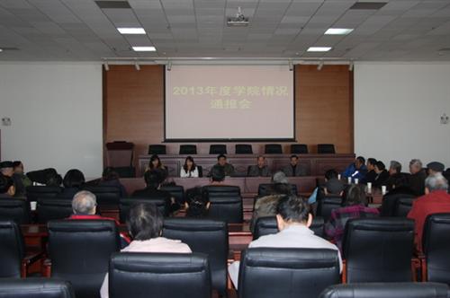 在2013年度学院情况报告中,王文院长从组织架构、制度建设、师资建设、行业发展、招生就业、提升办学效益、民生工程等六个方面进行了情况通报。王院长指出,在下一阶段的工作中,学院将通过拓展办学平台、争取独立科研项目和经费、探索国际教育新模式、开展分类教学等积极有效的方式解决学院发展面临的问题。