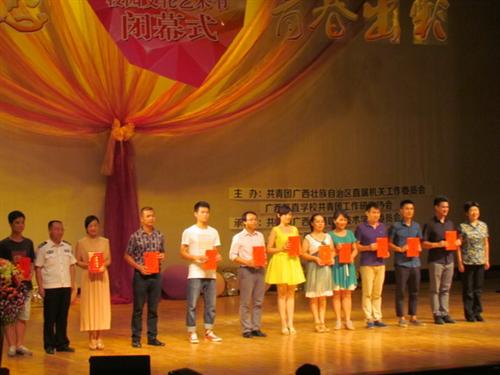 “中国梦想·青春出彩”第四届广西区直学校校园文化艺术节已于日前圆满落幕。我院学子喜获多项佳绩,其中,寇恩慧同学荣获诗文朗诵比赛一等奖,黄一轩同学荣获硬笔书法比赛一等奖,姜海潮、刘璐、黄方、邓盛盛、朱俊桦等五名同学荣获礼仪风采大赛二等奖,杨佳琳同学荣获校园歌手比赛三等奖,吴佩桧同学荣获软笔书法比赛三等奖,吴佩桧、覃春林等两名同学荣获国画比赛优秀奖,兰万聪、黄朗忠、刘佳、李颉、陈夏瑜、袁汝莹、黄韦林等七名同学荣获舞蹈比赛优秀奖;张凯、吴超强、谢晓明、谢欢等四名教师荣获优秀指导教师奖。