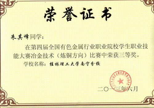 有色金属行业学生职业技能大赛冶金技术(炼铜方向)比赛三等奖证书