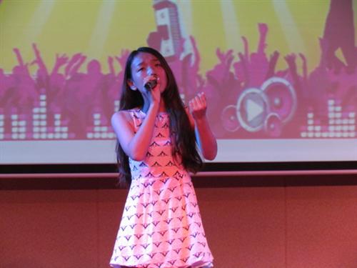 寇恩惠同学在诗文朗诵比赛现场 杨佳琳同学在校园歌手大赛现场