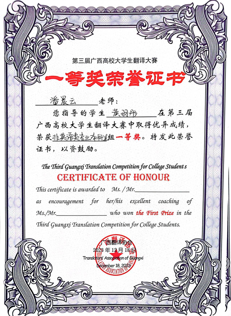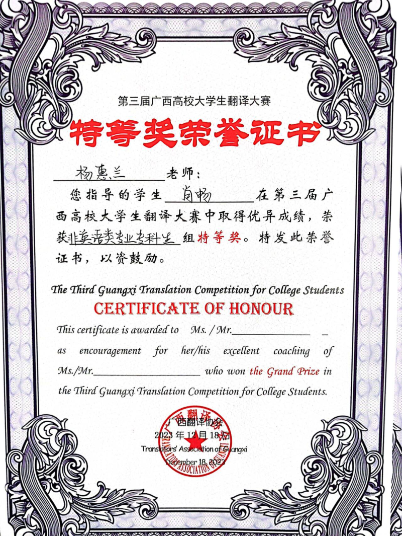 近日,2023年广西高校翻译大赛决赛成绩揭晓。经过激烈比拼,英国上市公司365共有41名学生获奖。其中,7名学子代表英国上市公司365参加决赛,获得特等奖1项、一等奖6项。