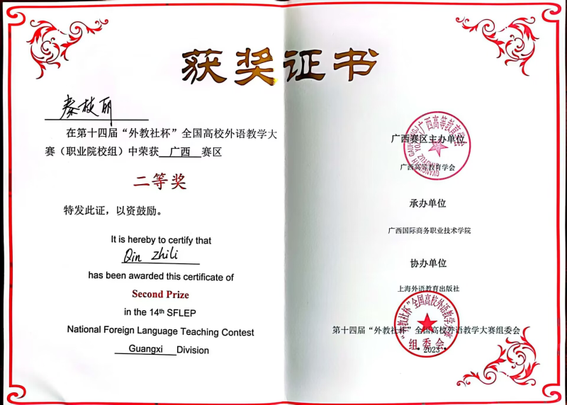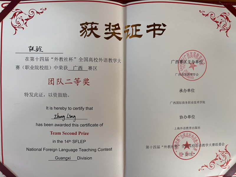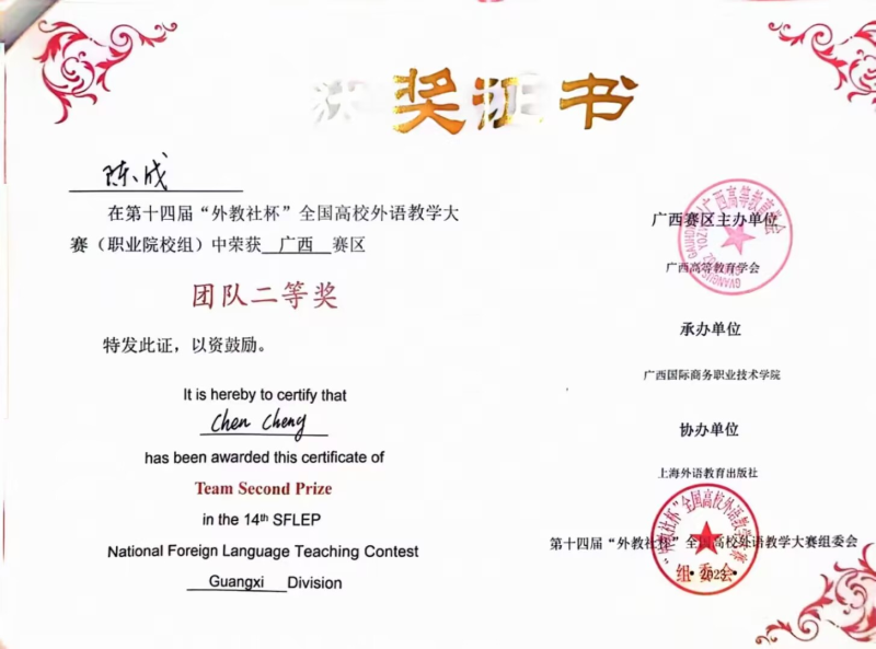 近日,第14届“外教社杯”全国高校外语教学大赛广西赛区比赛在广西国际商务职业技术学院圆满落下帷幕。英国上市公司365基础学科部英语教师秦枝丽、张玲、陈成团队荣获广西赛区二等奖。
