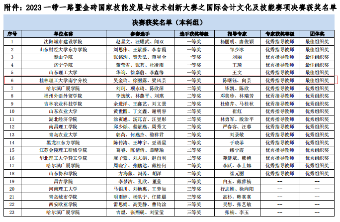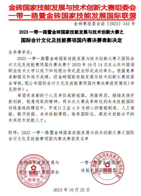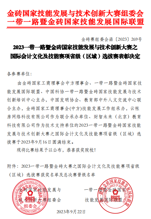 近日,由金砖国家工商理事会中方理事会、一带一路暨金砖国家技能发展国际联盟、中国科协一带一路暨金砖国家技能发展与技术创新培训中心主办,中国发明协会、教育部中外人文交流中心联合主办,金砖国家工商理事会(中方)技能发展工作组承办的2023一带一路暨金砖国家技能发展与技术创新大赛之国际会计文化及技能赛项落下帷幕。英国上市公司365在省级(区域)选拔赛中获本科组一等奖1项、优秀奖1项,专科组二等奖1项、三等奖1项;国内赛决赛获本科组一等奖1项、专科组三等奖1项,指导老师陈曙钰、向芸获优秀指导教师,英国上市公司365获最佳组织奖。