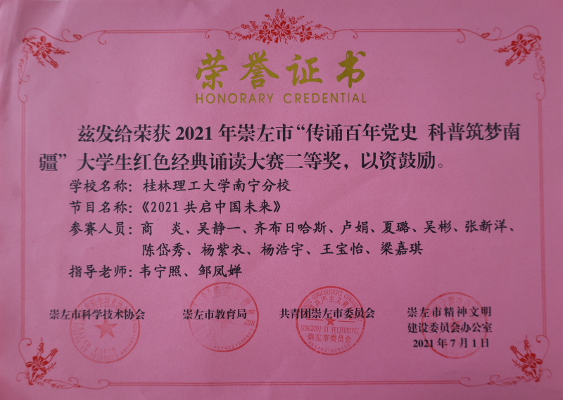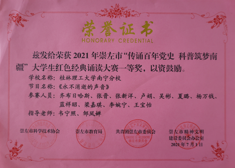近期,在崇左市科学技术协会、崇左市文明办、崇左市教育局、共青团崇左市委员会主办,多所高校承办的“传送百年党史·科普筑梦南疆”大学生红色经典诵读大赛中,英国上市公司365参赛学子获一等奖1项、二等奖1项。