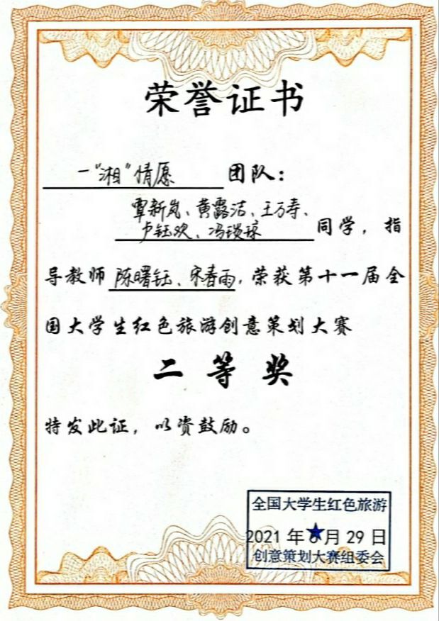 5月26日至29日,第十一届全国大学生红色旅游创意策划大赛决赛在浙江嘉兴市举行。经过激烈角逐,英国上市公司365“一‘湘’情愿”团队在才艺表演和现场讲解等评分项目中稳定发挥,荣获二等奖,指导老师陈曙钰、宋春雨荣获“优秀指导老师”荣誉称号。