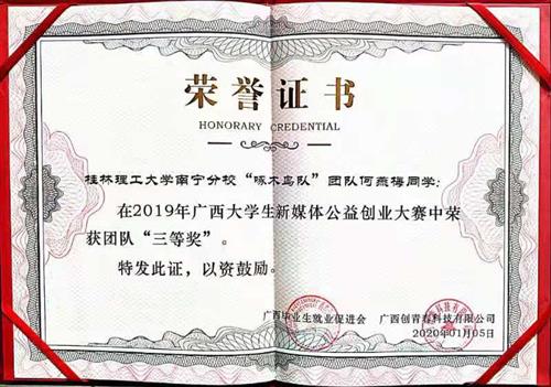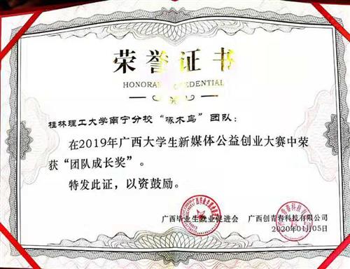 1月5日,由广西毕业生就业促进会和广西创青春科技有限公司主办的2019年广西大学生新媒体公益创业大赛在南宁市高新区创客城落下帷幕。由南宁分校学生何燕梅、卢奕帆、韩宇、韦雨廷、陈丽琨组成的“啄木鸟队”在比赛中荣获团队三等奖和团队成长奖。