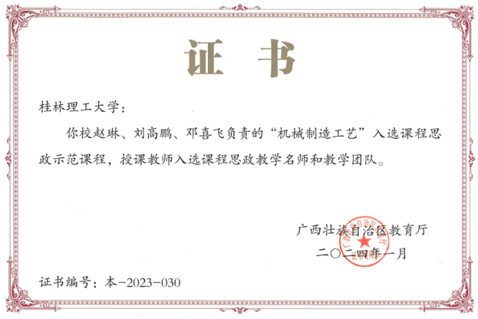 近日,自治区教育厅下发了《关于公布2023年全区高校课程思政示范课程和课程思政示范基层教学组织名单的通知》(桂高教〔2024〕3号),学校推送的“机械制造工艺”本科课程被认定为自治区级课程思政示范课程,课程负责人及团队被认定为自治区级课程思政教学名师和团队。