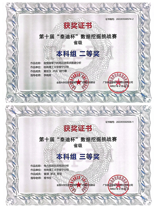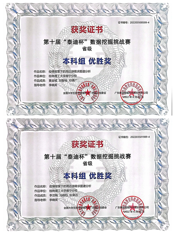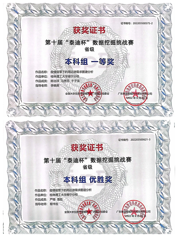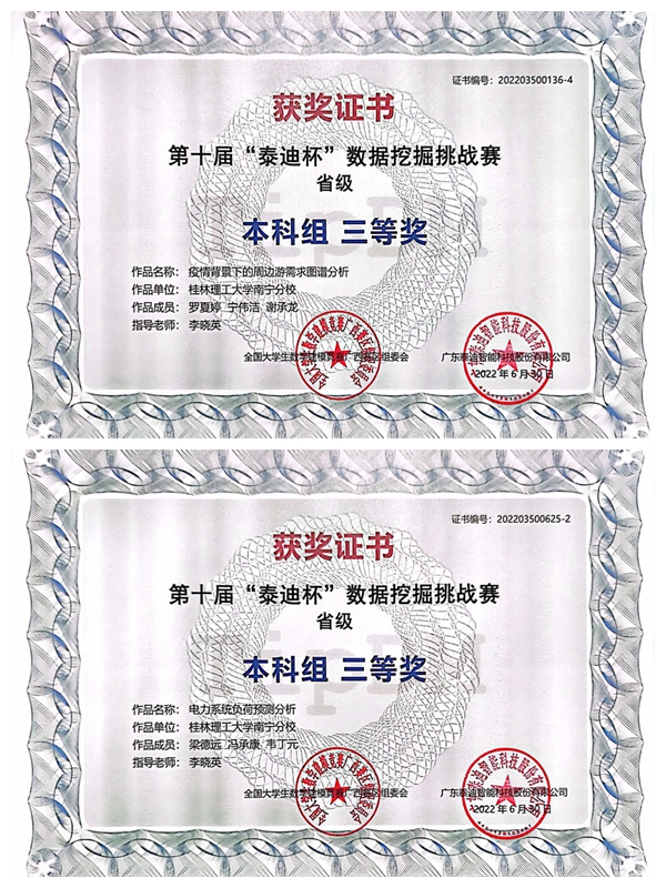 近日,第十届“泰迪杯”数据挖掘挑战赛获奖名单揭晓。本次竞赛历时两个月,共有来自全国340多所高校3754支队伍报名参赛。经过激烈角逐,英国上市公司365参赛队喜获本科组全国三等奖(前17%)2项;广西区级一等奖1项、二等奖1项、三等奖3项、优胜奖3项。