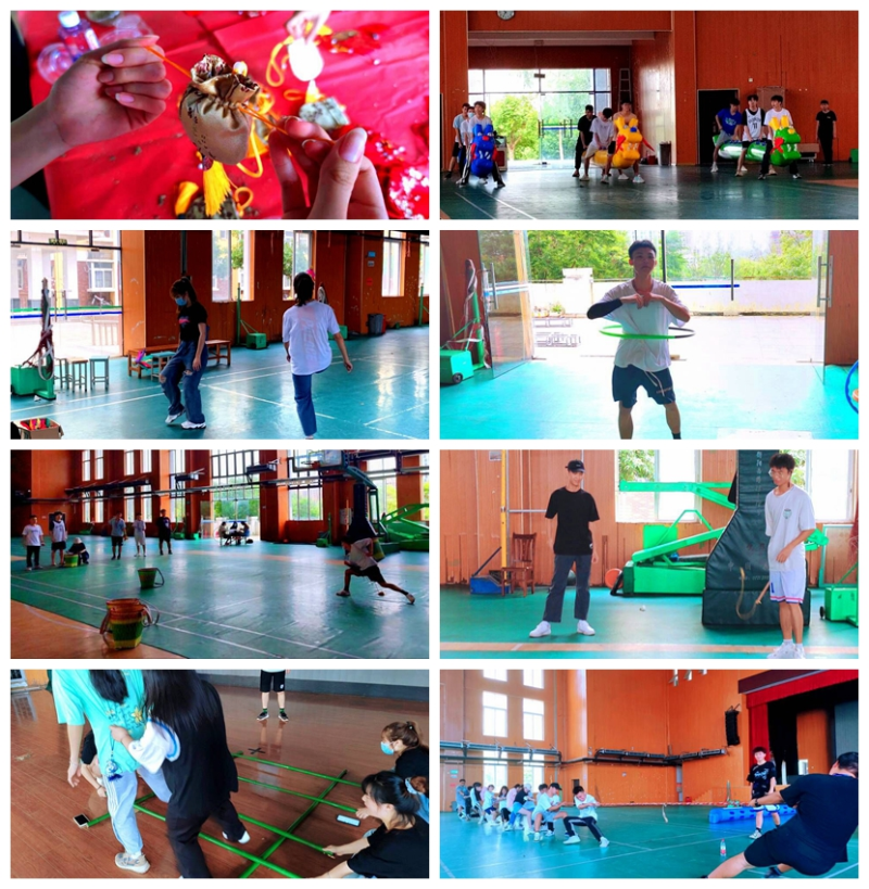 包香囊、地上旱龙舟、踢毽子、呼啦圈、抛绣球、抽木陀螺、竹竿舞、拔河活动