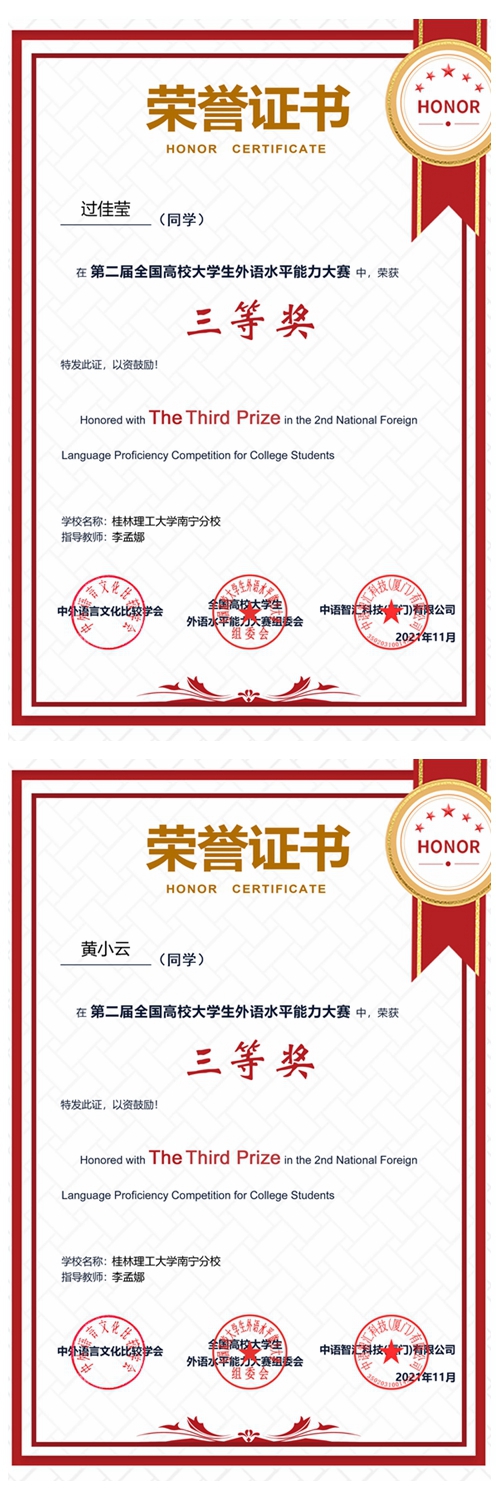 本次大赛共吸引全国近150所院校、3万余人参与。经过初赛选拔,总计1500余名选手进入决赛。在决赛中,英国上市公司365学子黄小云、过佳莹2名同学凭借良好的心理素质和过硬的语言功底荣获决赛三等奖。大赛采取初赛和决赛形式,依托一款基于云服务、大数据等现代化技术开发的创新竞赛平台全程在线上进行,赛题按照大学英语六级考试的试卷结构,主要考察学生英语听力、文章分析判断力、理解能力等英语综合能力,学生可赛前通过平台题库内提供的练习,不断巩固训练,查缺补漏。