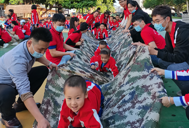 在另外一块场地上,师生通力配合,和小朋友一同开展“彩虹滑道”“抢球大作战”“丢沙包”“勇闯雷阵”互动游戏。活动场面热闹非凡,小朋友们尽情地玩耍,享受着快乐的幼儿时光。脸上洋溢着笑容,抵消了师生付出的汗水。