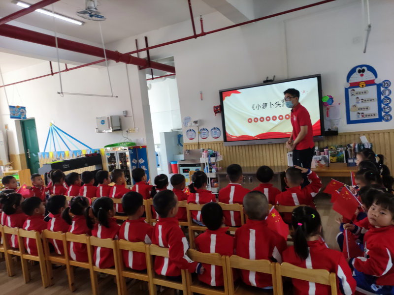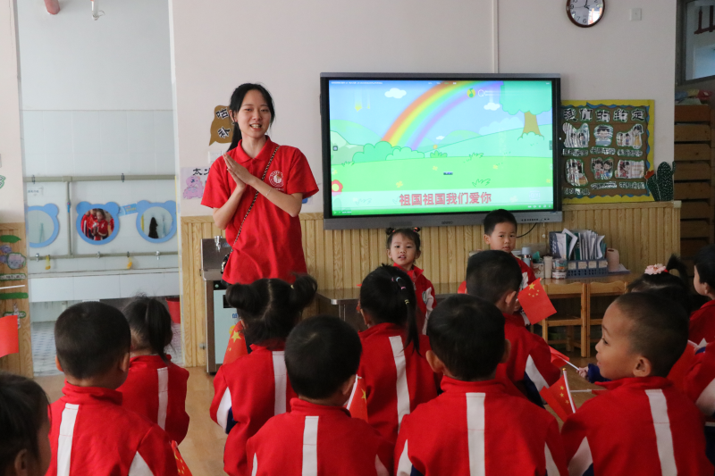 红色经典小故事讲述结束后,学生党员们和小朋友们在富有节奏的互动中一同歌唱《红星闪闪》《国旗国旗多美丽》和《祖国祖国我们爱你》红色歌曲。嘹亮的歌声响彻幼儿园上空,饱含感情地唱出了我爱祖国、童心向党的心声。