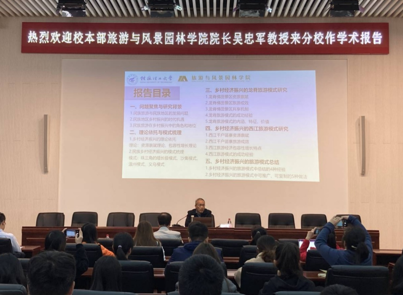 11月26日上午,学校旅游与风景园林学院、植物与生态工程学院院长、中国人类学民族学研究会民族旅游专业委员会主任、中国旅游研究院民族旅游研究基地首席专家、二级教授、博士生导师吴忠军在空港校区图书馆报告厅作“乡村产业振兴的旅游模式”学术报告。报告会由经济与管理系副主任劳国炜主持,该系旅游、会展、酒店专任教师及学生代表参加会议。