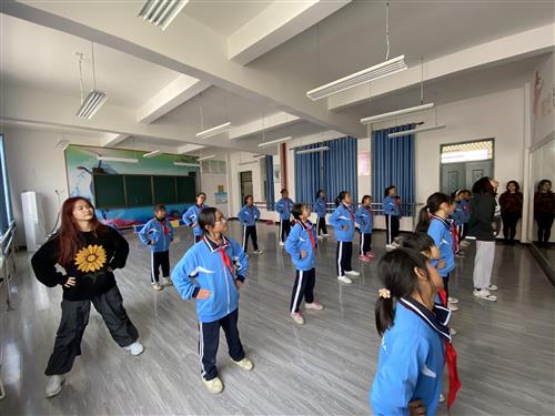 艺术课堂上学生党员在教小朋友们跳舞