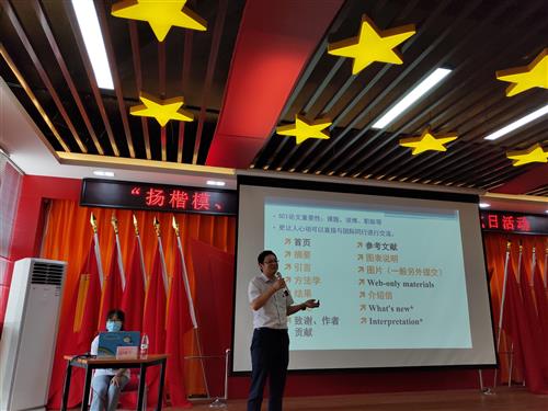 最后,优秀共产党员邓曙光同志分享科研工作经验,邓曙光同志多年深耕在科研创新的前沿领域,他就自身科研经历毫无保留地与师生党员们分享了外文撰写的方法和体会,从自身撰稿、审稿经验出发,介绍了外文论文撰写的流程和撰写方法,强调对外文论文中关键信息的提炼与表述。同时,介绍了一般的外文论文审稿流程并对如何应对审稿专家的意见提出实用性建议,并提议广大师生的党员要重视科研问题的提炼和发现,共同努力,争取更多有价值的优秀的科研论文得以发表。邓曙光同志的科研经验分享,对提升广大教师及学生党员的科研创新水平、培养独创性思维,进一步夯实未来的教学与科研有很大的帮助。