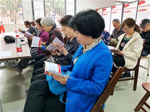 退休老党员们翻阅“不忘初心、牢记使命”主题教育知识手册