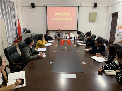 为贯彻落实《广西壮族自治区安全生产委员会办公室关于印发自治区成立60周年庆祝活动安全生产工作方案的通知》(桂安委办〔2018〕108号)等文件精神,11月22日下午,经济与管理系在景明楼210会议室召开学生安全稳定工作专题会议。该系主任周子平、党总支书记梁勤,副主任劳国炜、桑显洁,党总支副书记陈曙钰和全体辅导员参加会议,会议由该系党总支书记梁勤主持。