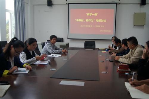 11月1日下午,经济与管理系党总支以党支部为单位在空港校区景明楼210会议室召开分别了“讲奉献,有作为”专题学习讨论会。经管系教师、学生党员参与讨论会,会议由各支部书记主持。