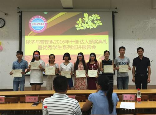 7月6日下午,经管系在空港校区启智楼208教室举行“十佳达人”颁奖典礼。分校学生工作部主任韦宁照,团委书记谢晓明,经管系党总支书记梁勤,副书记黄薇薇等领导老师出席了活动。