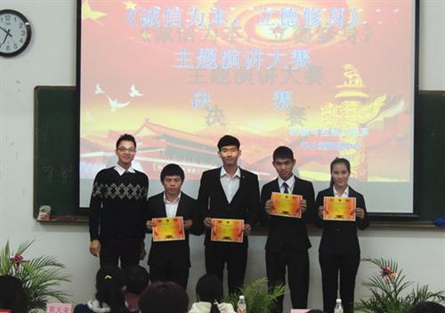 12月23日下午,机械与控制工程系在启智楼203多媒体教室举办“诚信为本,立德修身”主题演讲大赛决赛。该系学工组组长莫天荣,机械教研室主任甘卓权,教学秘书宁钰球,辅导员张斯亮出席比赛并担任评委。