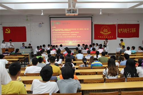 电气与电子工程系和机械与控制工程系联合举办的党知识竞赛于6月29日19:30在启智楼108室进行决赛,电气系党总支书记李培良、机械系党总支书记袁斌,两系辅导员老师到场观赛。每系派出两支参赛队伍,每队4人,参赛人员为两系通过初赛选拔的入党积极分子和预备党员。决赛在庄严的国歌声中拉开帷幕。