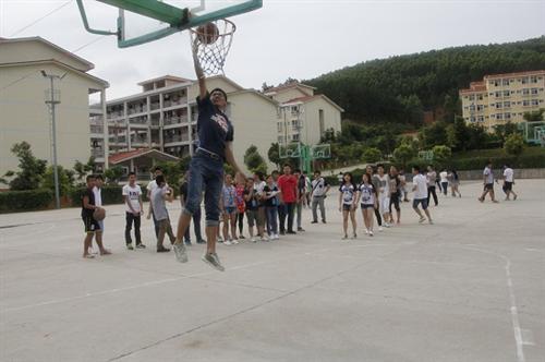 首先进行的活动项目是“三分钟限时上篮”活动。各班派出的四男四女参赛队员在3分钟内进行限时投篮接力,尽管烈日炎炎,但同学们依然兴致盎然,争分夺秒的进行比赛。随后进行的是“乒乓球总动员”活动,用抽签的方式决定击打乒乓球的是乒乓球拍或是其他金属盆、塑料盆、木板等道具。比赛过程异常激烈,参赛队员一个个精神抖擞,队友们都随着比赛加油鼓励,场面十分热闹。