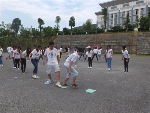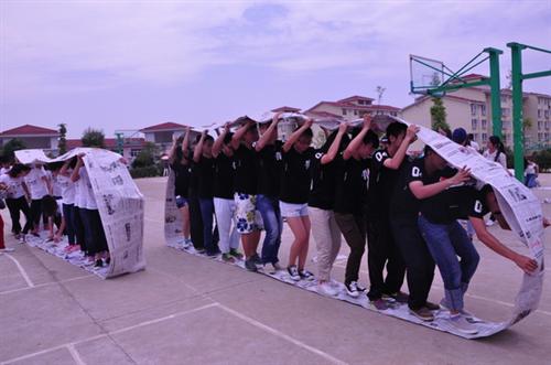 比赛集趣味性和团队性于一体,分为“无敌风火轮”、“过河拆桥”、“鼓舞飞扬”和“转移核废物”等四个项目,共有28支队伍参加。在比赛现场,同学们热情高涨,积极踊跃地体验户外拓展运动带给身心的愉悦,也切身领会到了沟通与合作的重要意义。薄薄的报纸被“团结”的胶布粘成了“无敌风火轮”,载着班级的梦想勇往直前;12个同学配合演绎“过河拆桥”,让同学们在活动中学会不抛弃、不放弃;一个球在8个人紧紧拽着的8根线中上下翻动,演绎着别样的“鼓舞飞扬”;由团队集体完成“搬运核废物”项目,既培养同学们的合作意识,也提高了对环保的认识。