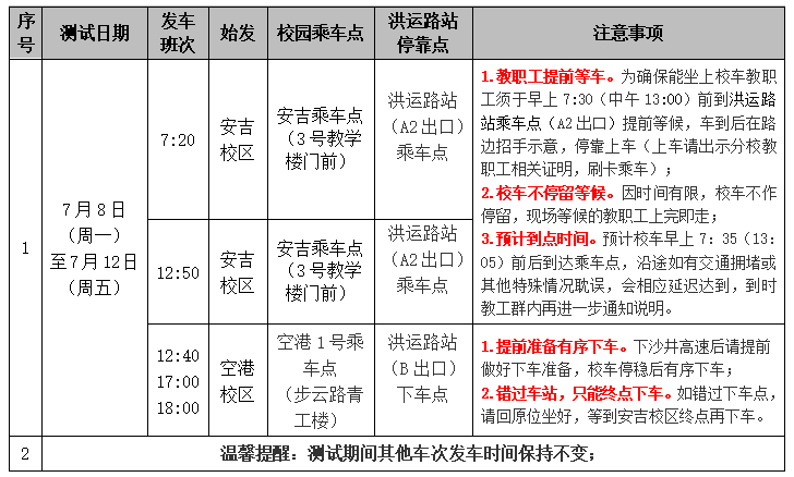 (一)保持上下车安全意识。因洪运路站上下停靠点为校外停靠点,社会交通情况复杂,请广大教职工上下车或存取行旅时一定要注意安全,待校车停稳后再有序上下车。