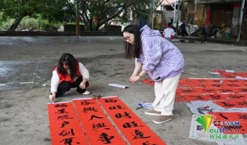 图为返家乡志愿者正在晒春联。中国青年网通讯员 邓嘉蕾 供图