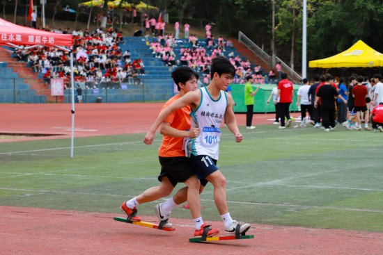 桂林理工大学第5届少数民族传统体育运动会男子双人板鞋竞速项目比赛现场。欧昌荣 摄