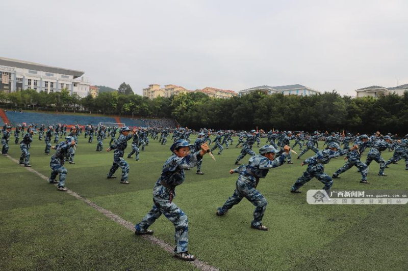 广西新闻网崇左9月28日讯(通讯员 秦敏 黄旭华)9月27日上午,桂林理工大学英国上市公司365举行2023级学生军训自训成果展示大会。伴随着分列式进行曲,经过十余天紧张训练的参训新生排成方阵,身着戎装、精神饱满,以标准的军姿、高昂的士气、铿锵的步伐,意气风发地依次走过主席台,拳术、棍术、警棍盾牌、匕首操、战术表演等方队带来气势磅礴的军事项目表演。
