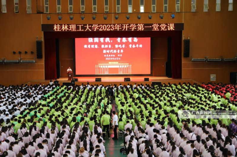 新生开学典礼上,桂林理工大学党委书记邓军以《强国有我,青春有为 做有理想、敢担当、能吃苦、肯奋斗的新时代好青年》为题讲授“开学第一堂党课”。党课上,邓军勉励全体青年学子点亮青春理想,以“千磨万击还坚劲,任尔东西南北风”的坚定信念,做有理想的新时代好青年;澎湃担当精神,以“士不可以不弘毅,任重而道远”的责任气魄,做敢担当的新时代好青年;淬炼吃苦意志,以“吃得苦中苦,方为人上人”的行动自觉,做能吃苦的新时代好青年;激昂奋斗旋律,以“为有牺牲多壮志,敢教日月换新天”的壮志豪情,做肯奋斗的新时代好青年。