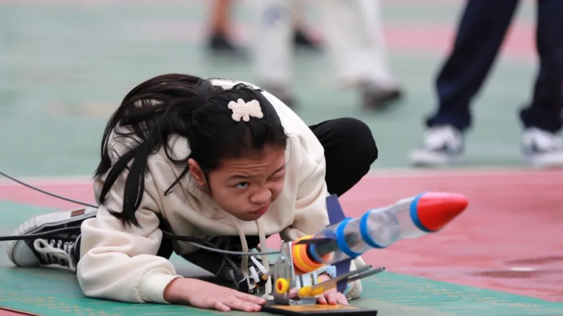 第四届扶绥县乡村学校少年宫素质教育技能竞赛中,参赛选手全神贯注参与气火箭项目比赛