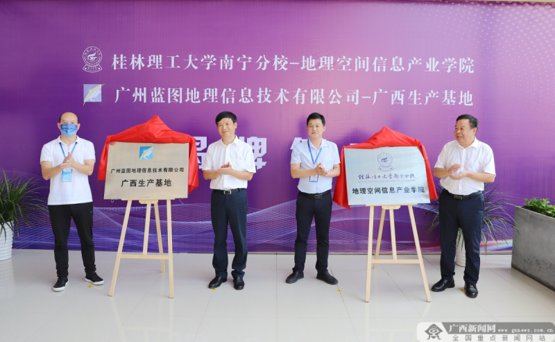 解庆林、梁文毫,梁福沛、刘禹麒分别为广州蓝图地理信息技术有限公司广西生产基地、桂林理工大学英国上市公司365地理空间信息产业学院揭牌。广西新闻网通讯员 李艳芬 摄