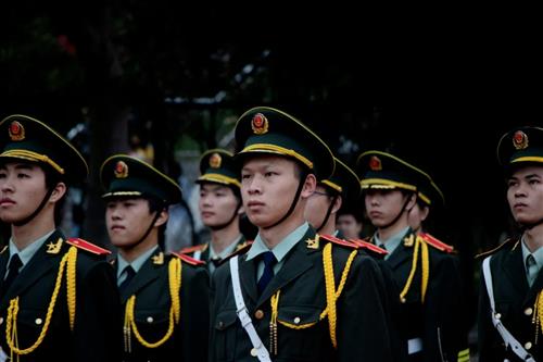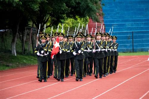 上午八时整,护旗手护卫着鲜艳的国旗,迈着矫健的步伐,护送国旗走到国旗台。随着雄壮的国歌声起,升旗手将国旗向空中扬起,鲜艳的五星红旗冉冉升起,迎风飘扬。