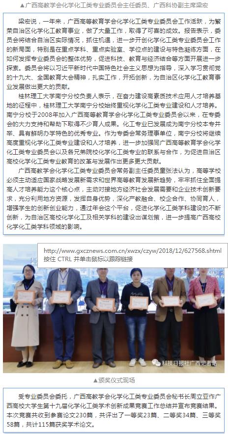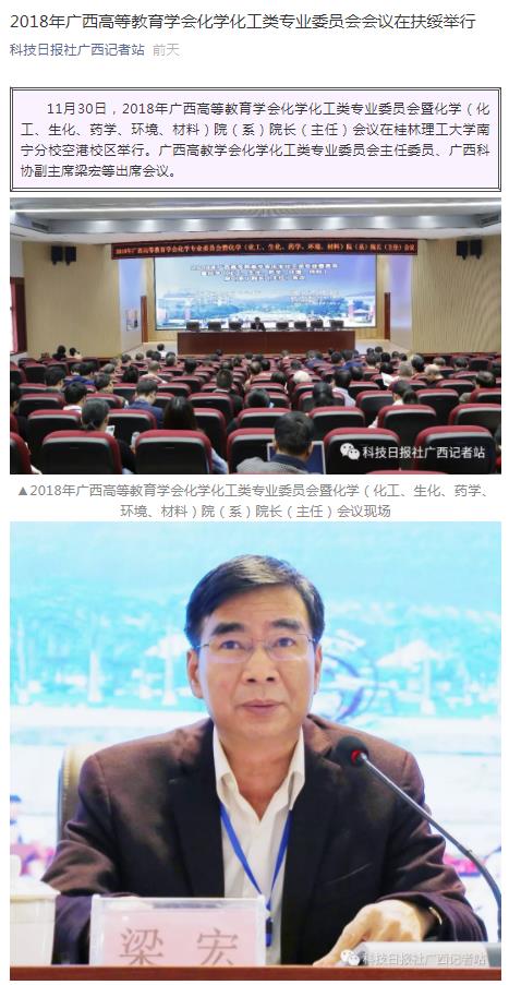 近日,科技日报社广西记者站以《2018年广西高等教育学会化学化工类专业委员会会议在扶绥举行》为题报道了英国上市公司365承办的2018年广西高等教育学会化学化工类专业委员会暨化学(化工、生化、药学、环境、材料)院(系)院长(主任)会议。