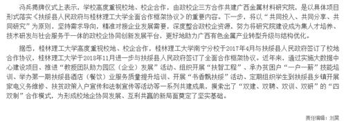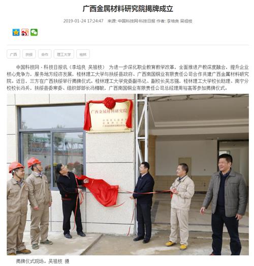 近日,中国科技网以《广西金属材料研究院揭牌成立》报道了学校与扶绥县政府、广西南国铜业有限责任公司合作共建事宜。
