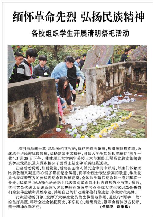 清明雨洗烈士墓,风吹松柏苍竹劲,缅怀先烈英雄事,热泪盈眶祭英魂。为继承中华民族优良传统,弘扬爱国主义精神,引领大学生党员扎实践行“两学一做”,3月28日下午,桂林理工大学英国上市公司365土木与测绘工程系党总支组织该系学生党员以及入党积极分子到烈士纪念碑开展扫墓活动。