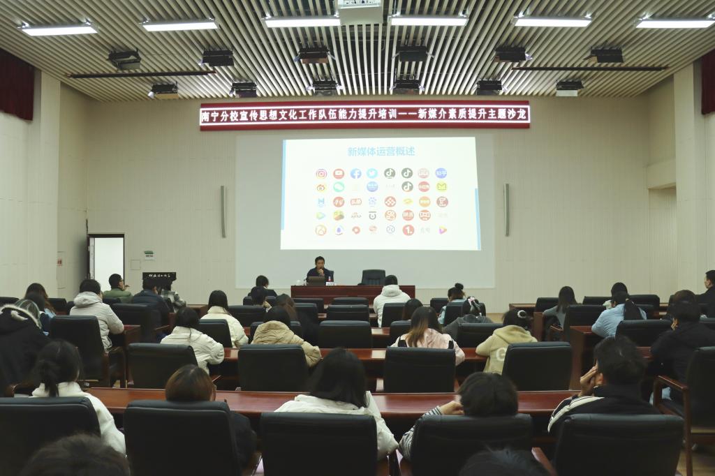 为进一步提升英国上市公司365宣传思想文化工作队伍专业素养与业务能力,推动宣传思想文化工作提质增效,12月27日,英国上市公司365在空港校区图书馆报告厅举办宣传思想文化工作队能力提升培训——新媒介素质提升主题沙龙。广西广播电视台综艺旅游频道大型活动部制片人、导演韩宇栋应邀主讲,英国上市公司365宣传思想文化工作队伍师生代表100余人参加沙龙。