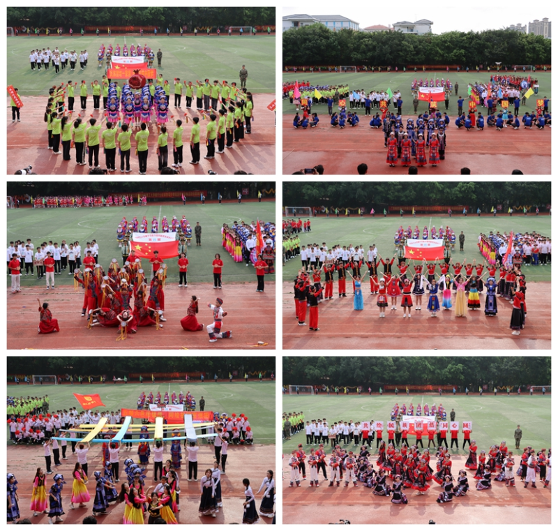 开幕式上,伴随着激昂的运动员进行曲,国旗队、会旗队迈着铿锵有力的步伐护送鲜艳的五星红旗、民运会会旗进入会场,彩旗队和各学院方队紧随其后,迈着整齐划一的步伐陆续入场。主席台前,各学院独具创意的方队表演,民族体育龙狮展演、藏族操、壮族扁担舞等表演将现场气氛推向高潮,为大家呈现了一场气势磅礴的视觉盛宴。
