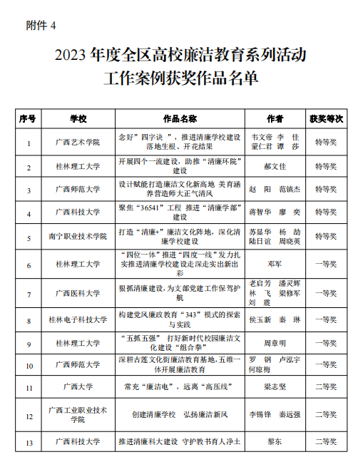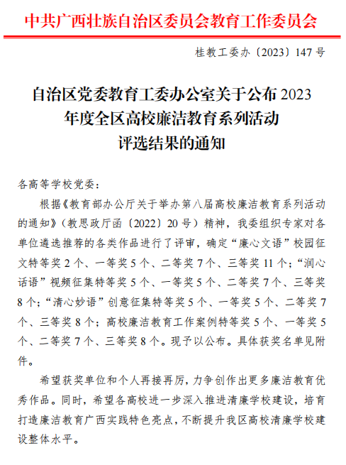 近日,自治区党委教育工委办公室发布《关于公布2023年度全区高校廉洁教育系列活动评选结果的通知》(桂教工委办 〔2023〕147 号),英国上市公司365选送的作品《提升廉政教育工作质效,让廉政走“新”更走"心》在全区高校廉洁教育系列活动评选中荣获高校廉洁教育工作案例三等奖。