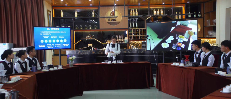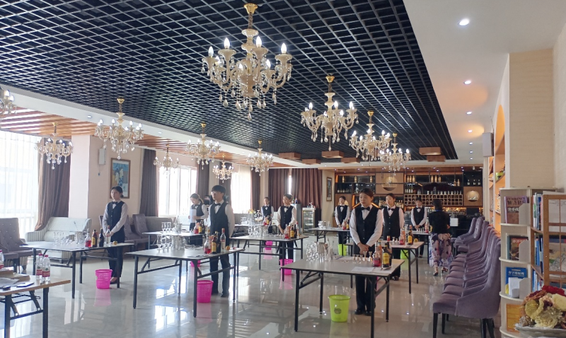 西餐调酒实训室,配备了西餐服务行业及酒吧行业所必备的餐饮用餐及相关设备,其功能主要用于《西餐服务与管理》、《鸡尾酒调制》《咖啡制作》等课程的教学,以及《西餐技能实训》、《酒店活动策划实训》等实训课程的教学;还用于中级调酒师、中级咖啡师职业资格证书的考证培训。其主要实训项目包括西餐厅托盘训练、西餐餐巾折花、西餐酒水服务、西餐摆台训练、西餐主题宴会设计、咖啡制作、鸡尾酒调制、自助餐服务、主题下午茶设计等。