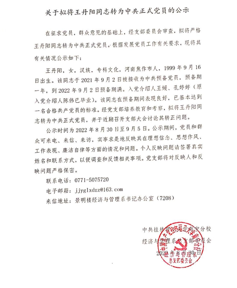 关于拟将王丹阳同志转为中共党员的公示