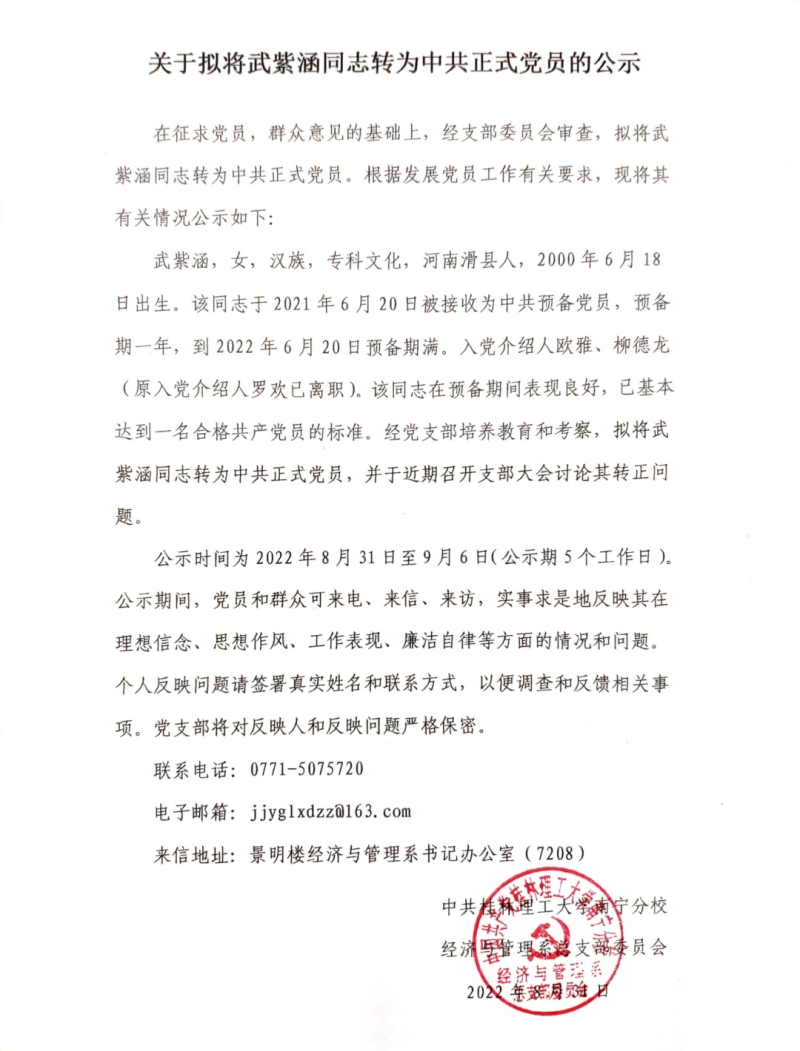 关于拟将武紫涵同志转为中共党员的公示